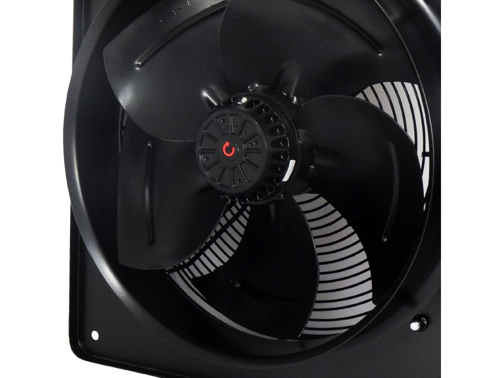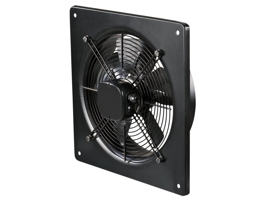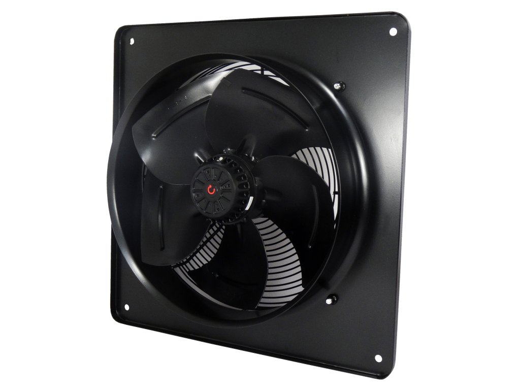 Průmyslový axiální ventilátor Dalap RAB TURBO/400V 200 o průměru 230 mm na 400 V, se čtvercovou montážní deskou k nástěnné instalaci.