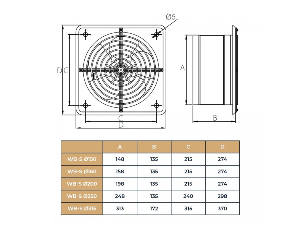 Nástěnné ventilátory Dospel WB-S jsou vyrobeny z ocelového plechu s černým lakem, vrtule je hliníková s ochranou krycí mřížkou, která je drátěná a galvanizovaná. Ventilátory mají tvar čtverce s kruhovým vyústěním pro osazení do potrubí nebo k odvětrávání přímo přes zeď.