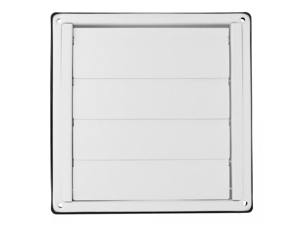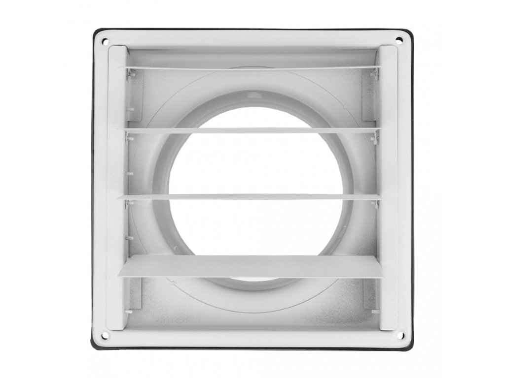 Nerezová ventilační mřížka vmatně bílé barvě Dalap GM 125 RFNW 180x180 mm je vhodná k instalaci na fasádu pro ukončení vzduchovodu o průměru 125 mm.
