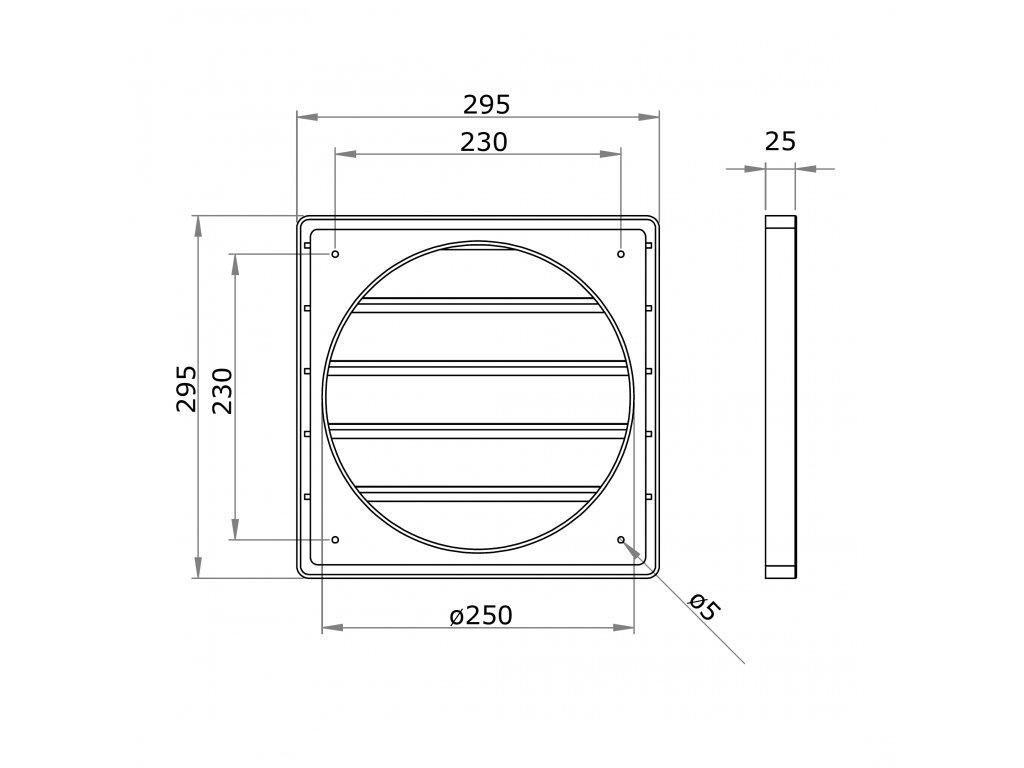 Šedá větrací mřížka 295x295 mm s přírubou o průměru 250 mm je vhodná jak pro větrání, tak i k odvětrávání. Mřížka má gravitační žaluzie se sklonem (pokud je zapnutý ventilátor, tak vlivem proudění vzduchu jsou žaluzie zvedlé, po vypnutí ventilátoru se žaluzie zaklapnou a zabraňují zpětnému proudění vzduchu).
