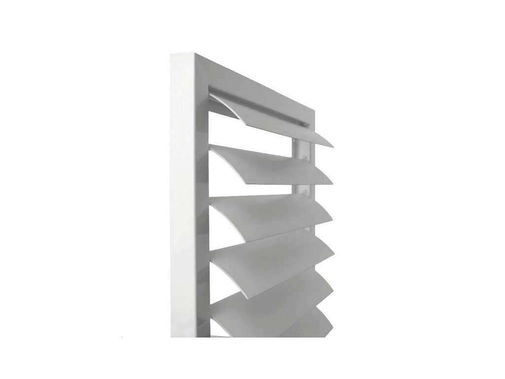 Větrací mřížka se samotížnou žaluzií, kovový rám, plastové žaluzie. Vhodná pro montáž na fasády domu pro odvětrání WC, koupelny, kuchyně, garáže, sklepy, restaurace a pod. Pro svou velikost mřížka vhodná pro větší ventilátory a pro průmyslové využití.