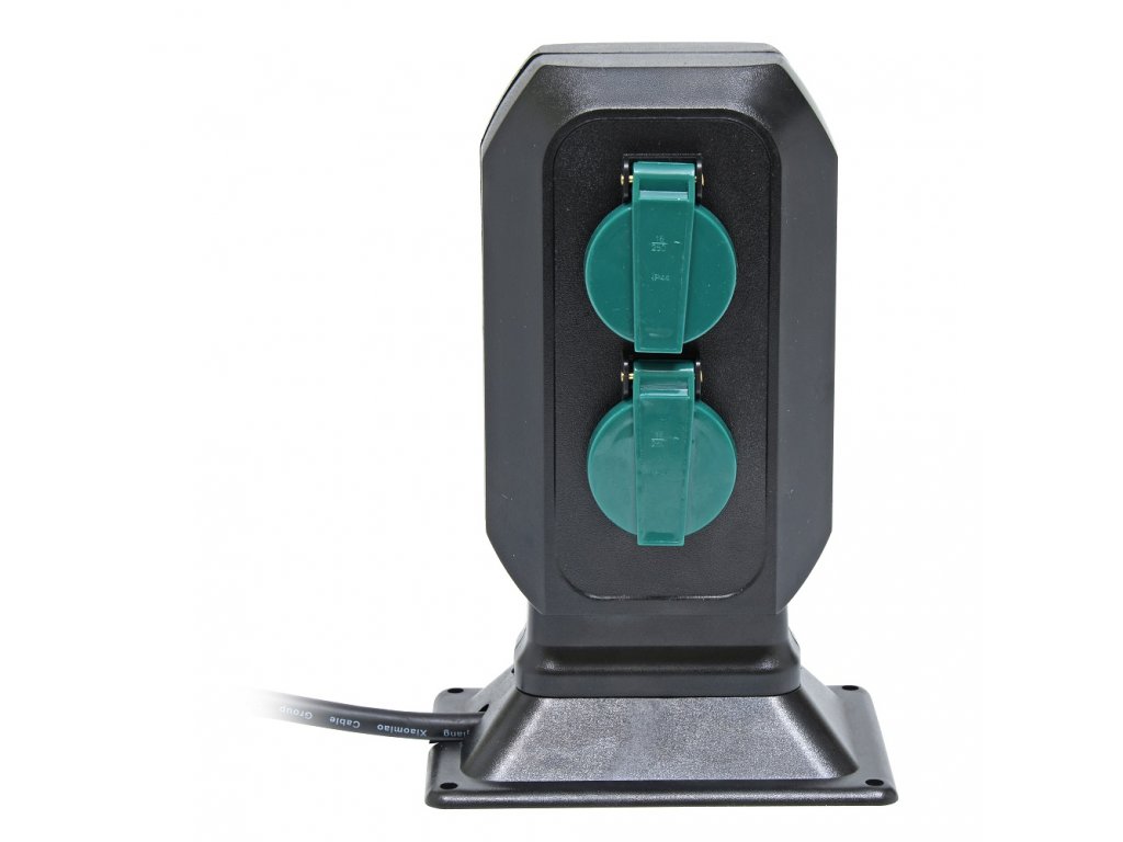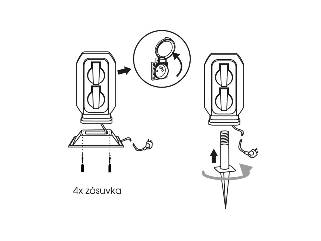 Je vybaven hrotem pro upevnění v zemi, disponuje 4 zásuvkami. Přívodní kabel má 3 žíly s průřezem 1,5 mm2.