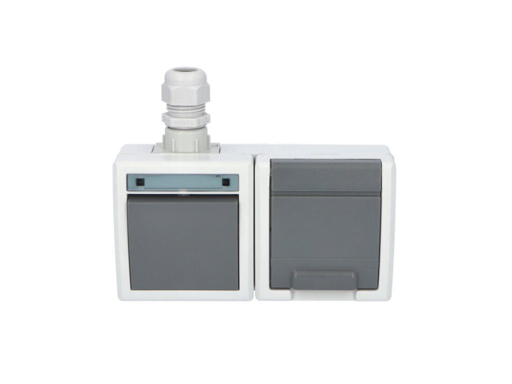 Venkovní zásuvka v kombinaci s vypínačem č. 6 ve vyšším krytí Atlas IP65 se šroubovou vývodkou M20 pro kabely CYKY-J 3x1,5 až 5x2,5.